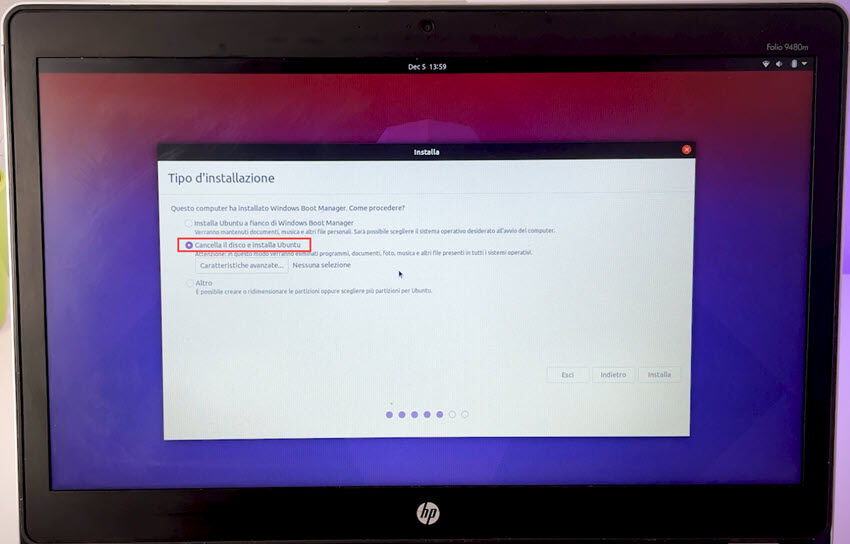 - Tipo d’installazione: per poter eseguire una installazione pulita di Ubuntu e rimuovere vecchi sistemi operativi già presenti, bisogna selezionare la voce Cancella il disco e installa Ubuntu.
