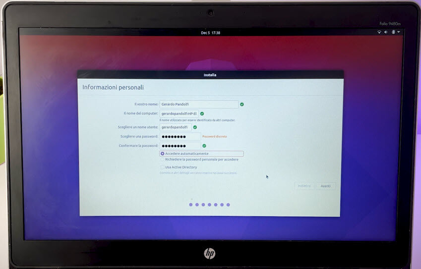 - Informazioni personali: in questo ultimo step dobbiamo inserire i dati che diventeranno il nome visualizzato, il nome utente, computer e password