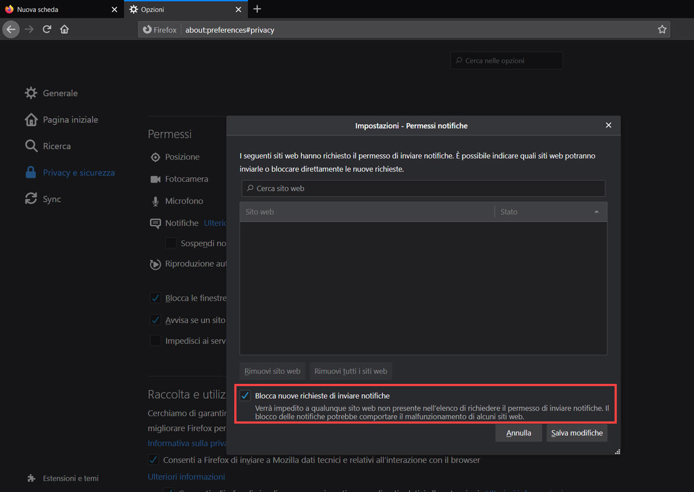 Per completare il tutto e disattivare la richiesta di notifica, dobbiamo selezionare la voce Blocca nuove richieste di inviare notifiche. A questo punto Salva modifiche e abbiamo concluso