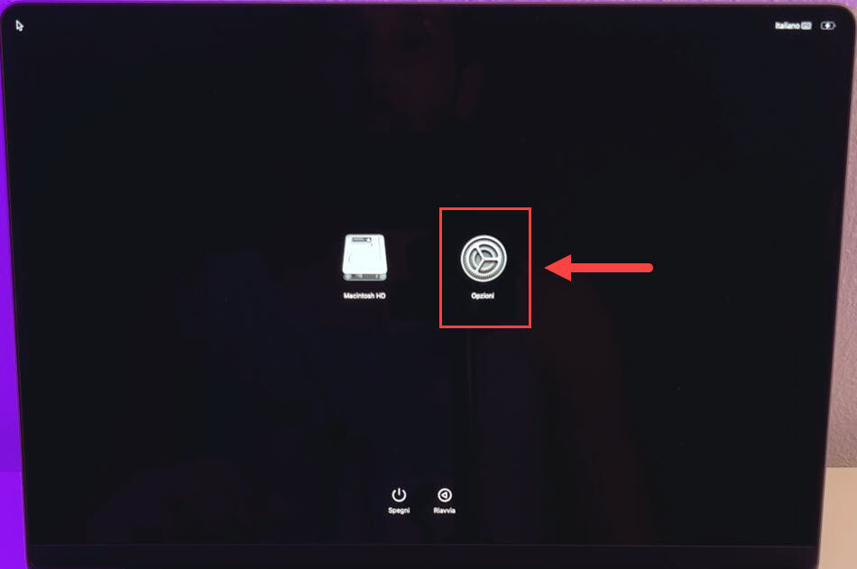 Caricata la schermata delle opzioni di avvio, avremo due scelte, se usare il Macintosh HD oppure Opzioni. Noi dobbiamo selezionare Opzioni. Selezionando il disco il Mac si avvierà normalmente.