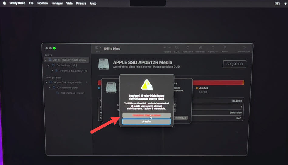 Attenzione: cliccando Inizializza verrà cancellato tutto il contenuto del disco e non sarà reversibile – tutto il contenuto andrà perso