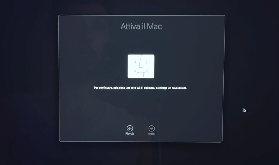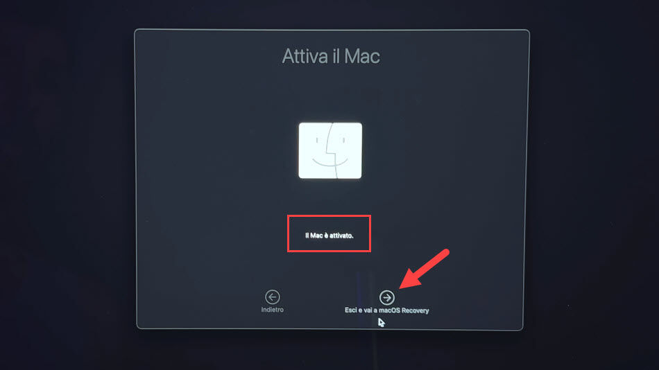 Prima di accedere completamente alla Recovery Mode, ci viene mostrata la schermata “Attiva il Mac”. In questo caso dobbiamo collegare il Mac alla rete internet e in pochi secondi il dispositivo verrà attivato e potremo cliccare avanti cliccando su “Esci e vai a macOS Recovery”.