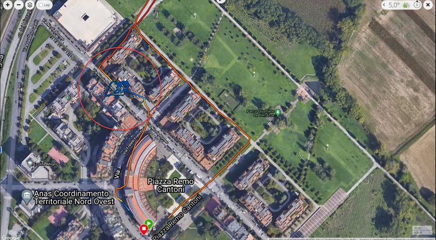 Incredulo da quanto accaduto durante la corsa ho pensato di fare una camminata, andatura più lenta (manco fossi Flash durante la corsa) e se mai fosse stato un problema legato a qualche lag di sistema, ingenuamente ho pensato di poter risolvere così. Niente, risultato molto discutibile del tracciato.
