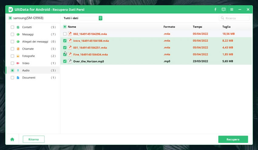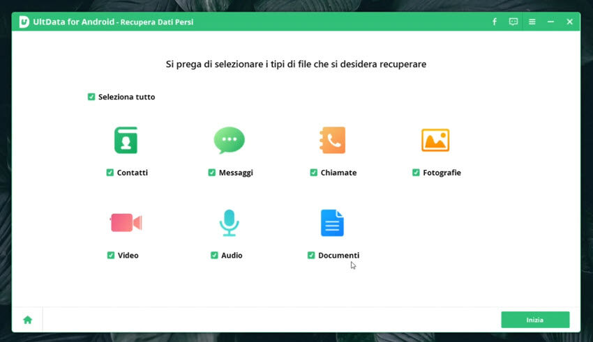Ora che anche il nostro smartphone è pronto, potremo accedere alla home di UltData e iniziare a sfruttare tutte le potenzialità della funzione Recupera Dati Persi. Questa funzione permette di poter recuperare contatti, messaggi, registri chiamate, foto, video, audio e documenti che sono stati persi o cancellati.