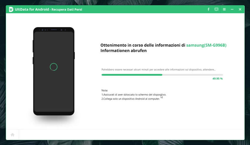 Una volta installato, potremo collegare il nostro smartphone al pc e lo stesso programma ci spiegherà cosa fare. Infatti per poter usare UltData dovremo necessariamente attivare la Debug USB sul nostro dispositivo. Gli step sono illustrati in modo esaustivo e sono validi per tutti i dispositivi Android. La debug usb è una funzione nascosta che è stata pensata per gli sviluppatori i quali necessitano di particolari funzioni per poter verificare il corretto funzionamento del dispositivo.